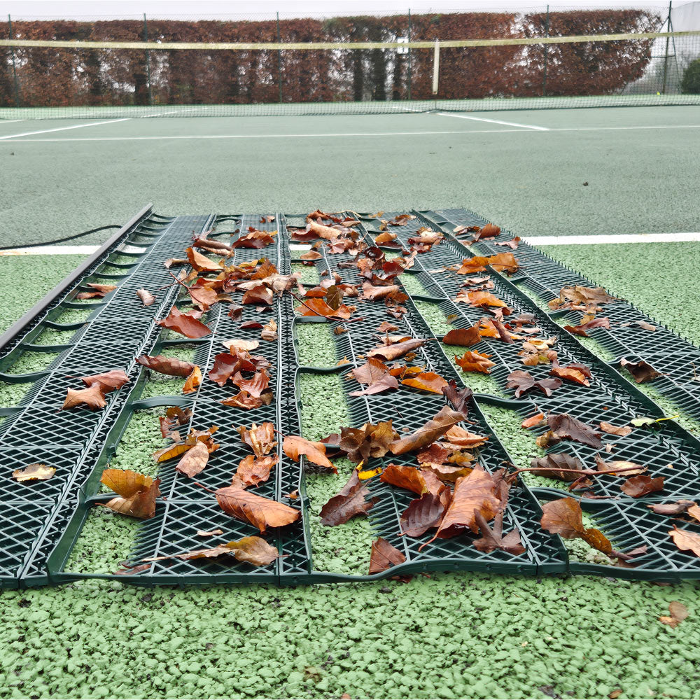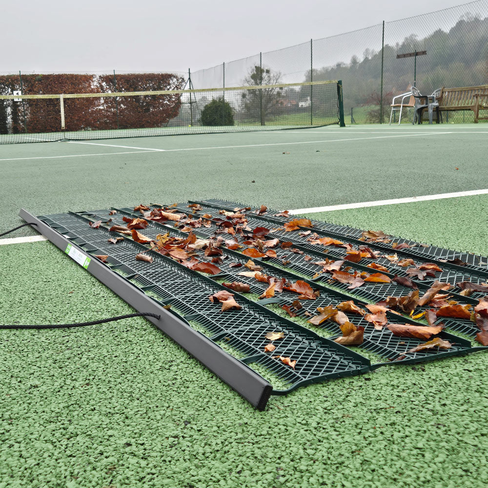 No more frustrating raking, sweeping, vacuuming or blowing leaves and debris around your court. The debris gets trapped on the barbed surface of the mat. It can then be shaken off after the court surface has been swept.