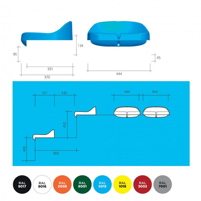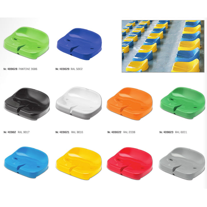 Compact grandstand seats without backrest from durable weather resistant injection-moulded polypropylene. A very strong, UV-resistant seat with water drainage points.